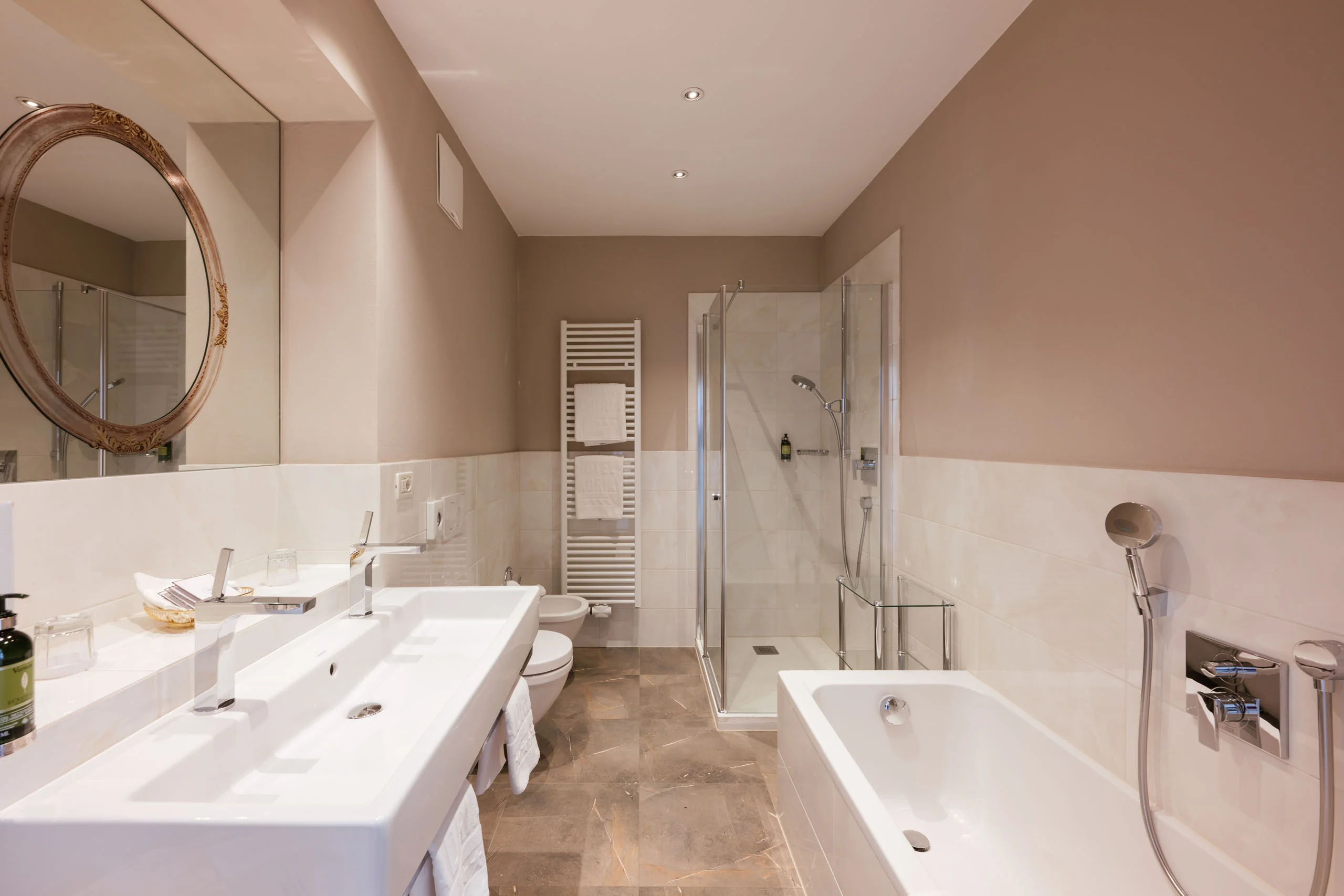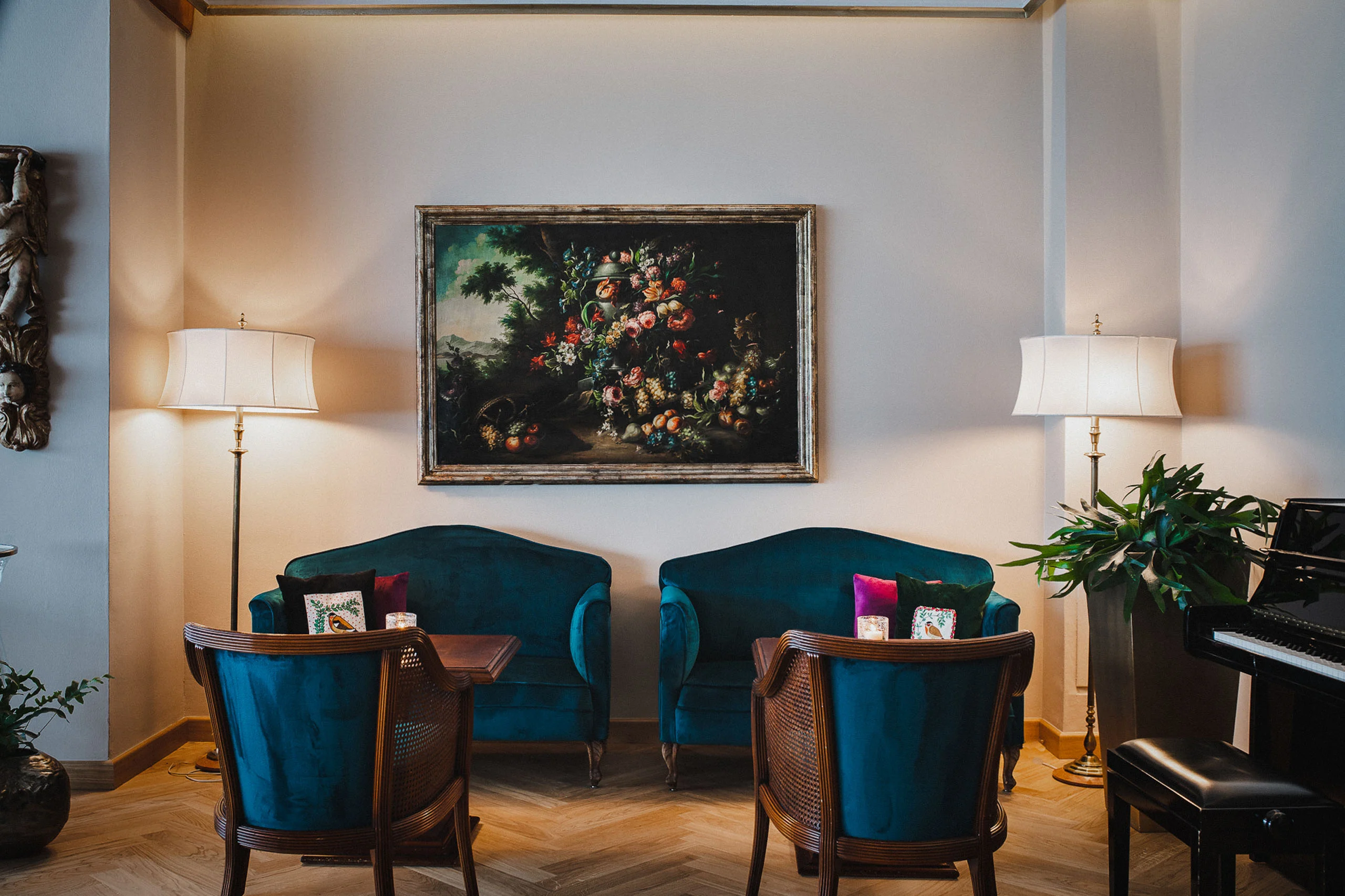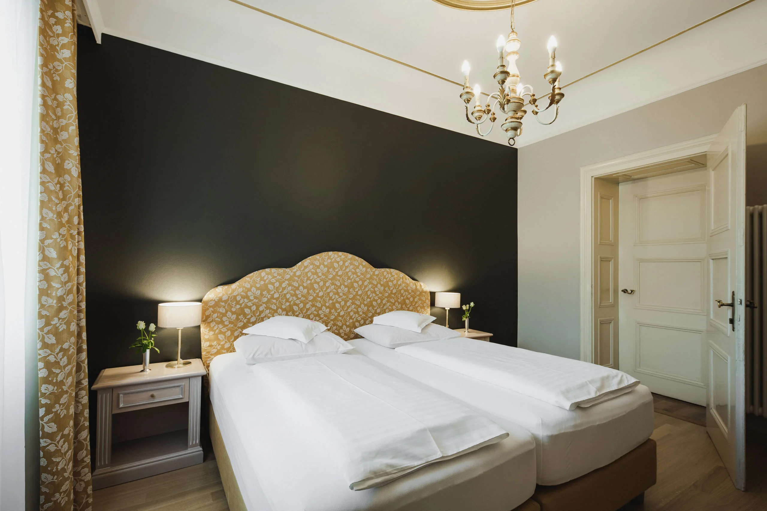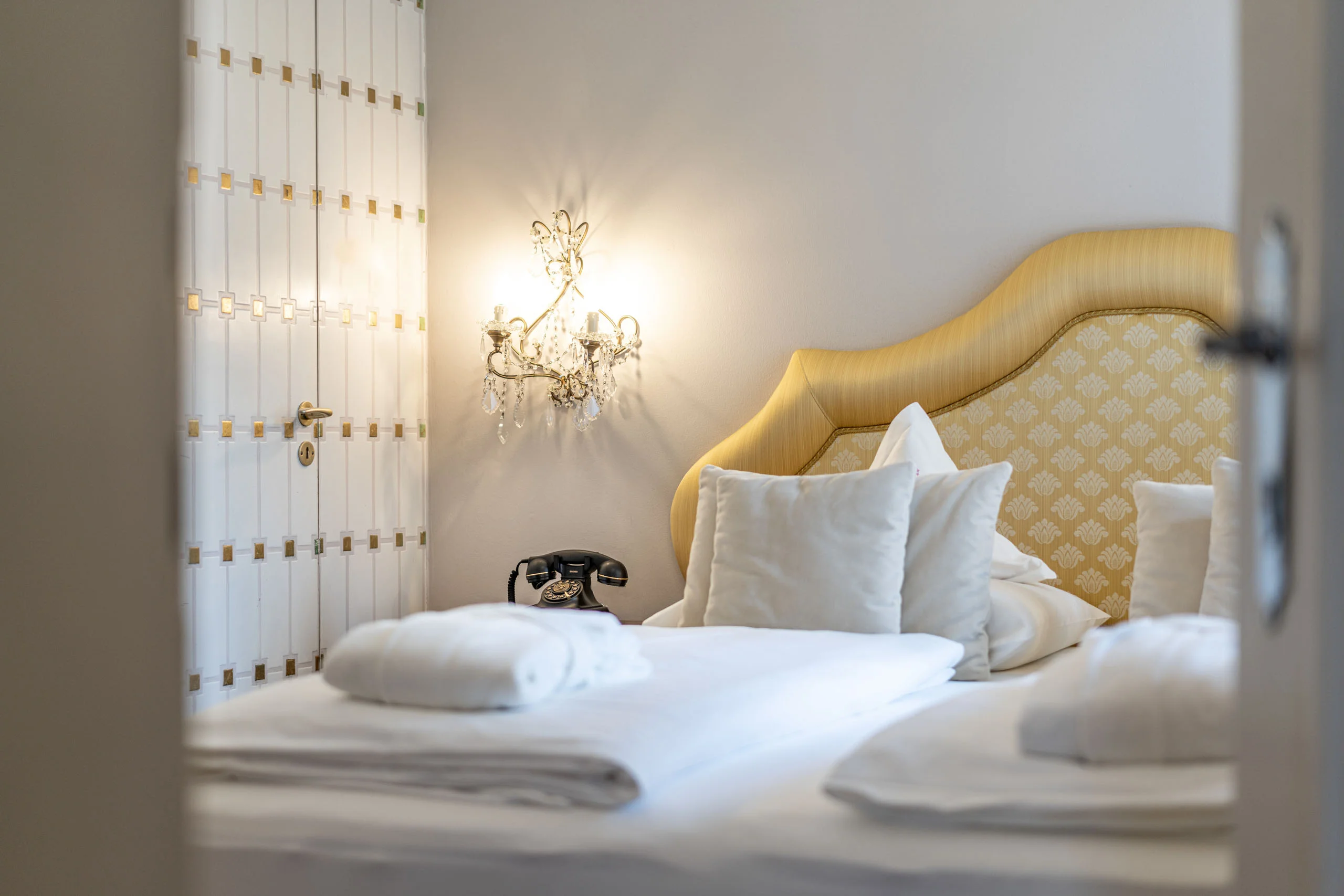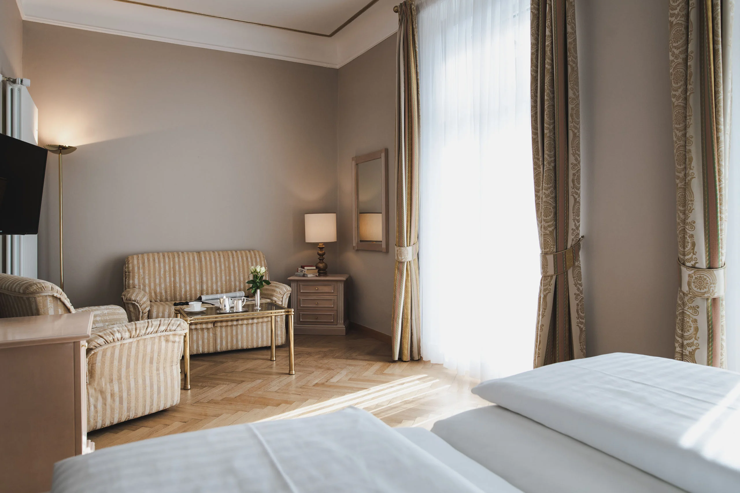 For anyone who loves Sissi as much as the glamour and opulence of bygone eras. Gold, velvet, and cream tones, a separate bedroom and living area, original furniture, and a loggia from which you can take in the sights of Merano in peace. A suite that combines the Belle Époque with modern comforts.